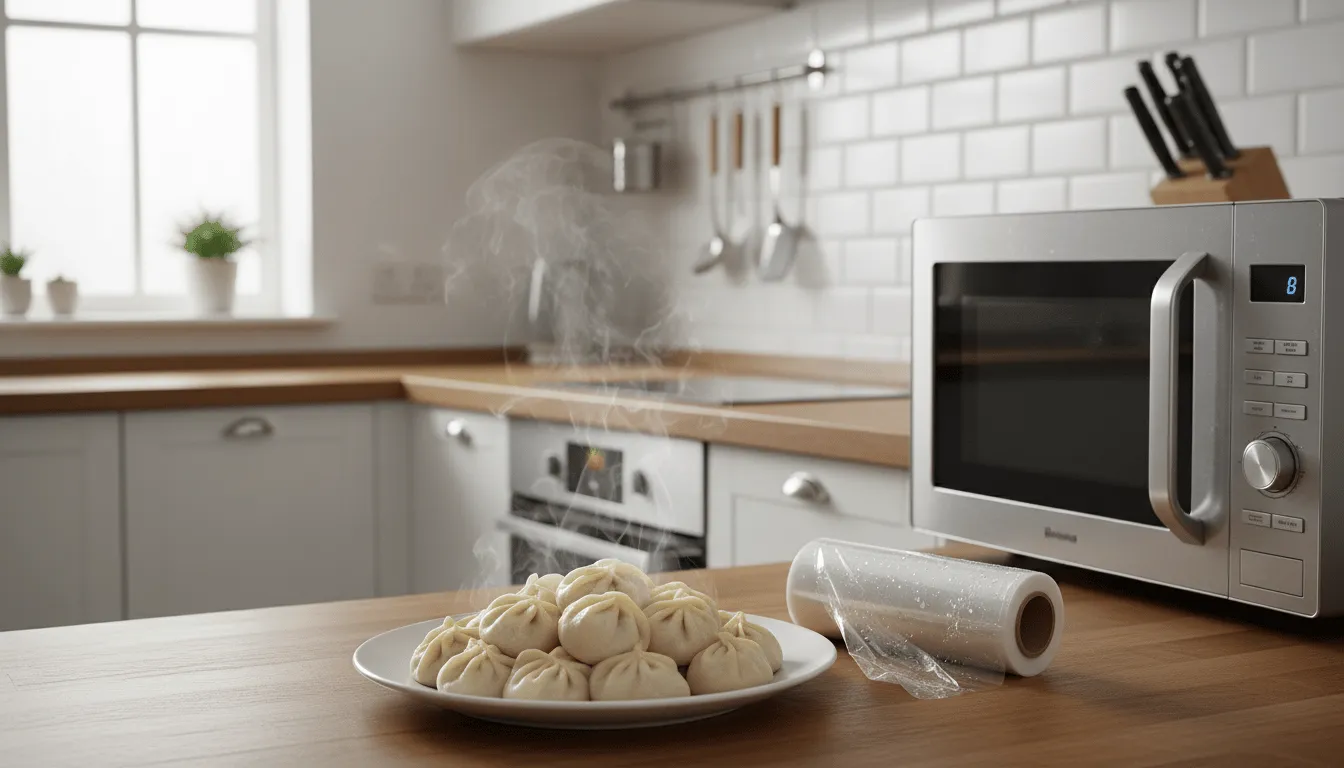 그다음 중요한 단계는 바로 ‘밀폐’입니다. 그릇 윗면을 랩으로 꼼꼼하게 씌워주세요. 이때 주의할 점은 랩을 팽팽하게 씌운 뒤, 포크나 젓가락을 이용해 랩 표면에 구멍을 대여섯 개 정도 뚫어주는 것입니다. 이 구멍은 내부의 압력을 조절하고 수증기가 원활하게 순환하도록 돕는 ‘숨구멍’ 역할을 합니다. 구멍을 뚫지 않으면 가열 도중 발생한 강한 증기 압력으로 랩이 터지거나 만두 모양이 망가질 수 있으니 잊지 말고 꼭 챙겨야 할 과정입니다.